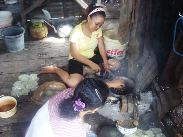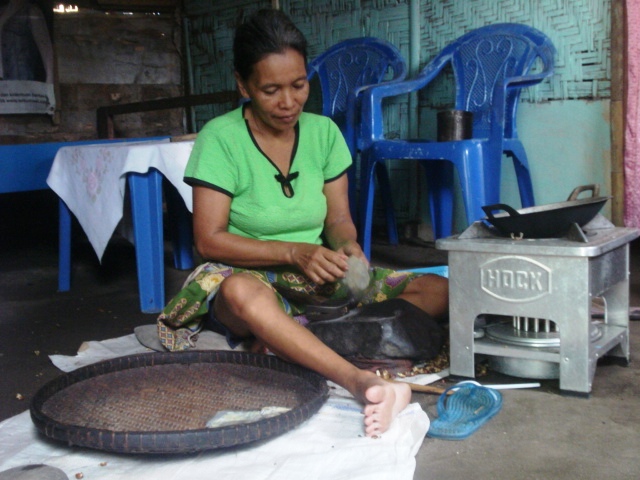 Memasuki pintu rumah, mataku langsung tertuju pada seorang ibu, berusia paruh bayah yang sedang asyik memainkan palu di atas batu berukuran segi empat beralaskan plastik bening, berselip, biji melinjo yang sebelumnya telah disangrai dengan menggunakan kuali dan kompor minyak.